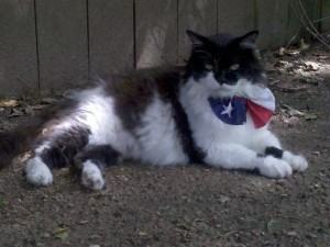 I saw Texas Ray yesterday, a big old Texas-sized guy of a cat, who has the whole neighborhood loving him, because he’s such a character. Texas (“Not Tex, he’s too big for shortening his name,” says Shelly, his proud owner, who took him in as a bony young stray so many years ago) had a clear case of ADR.