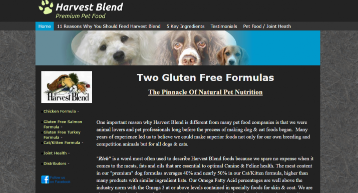 The Harvest Blend Dog Food product line lists three dry recipes.